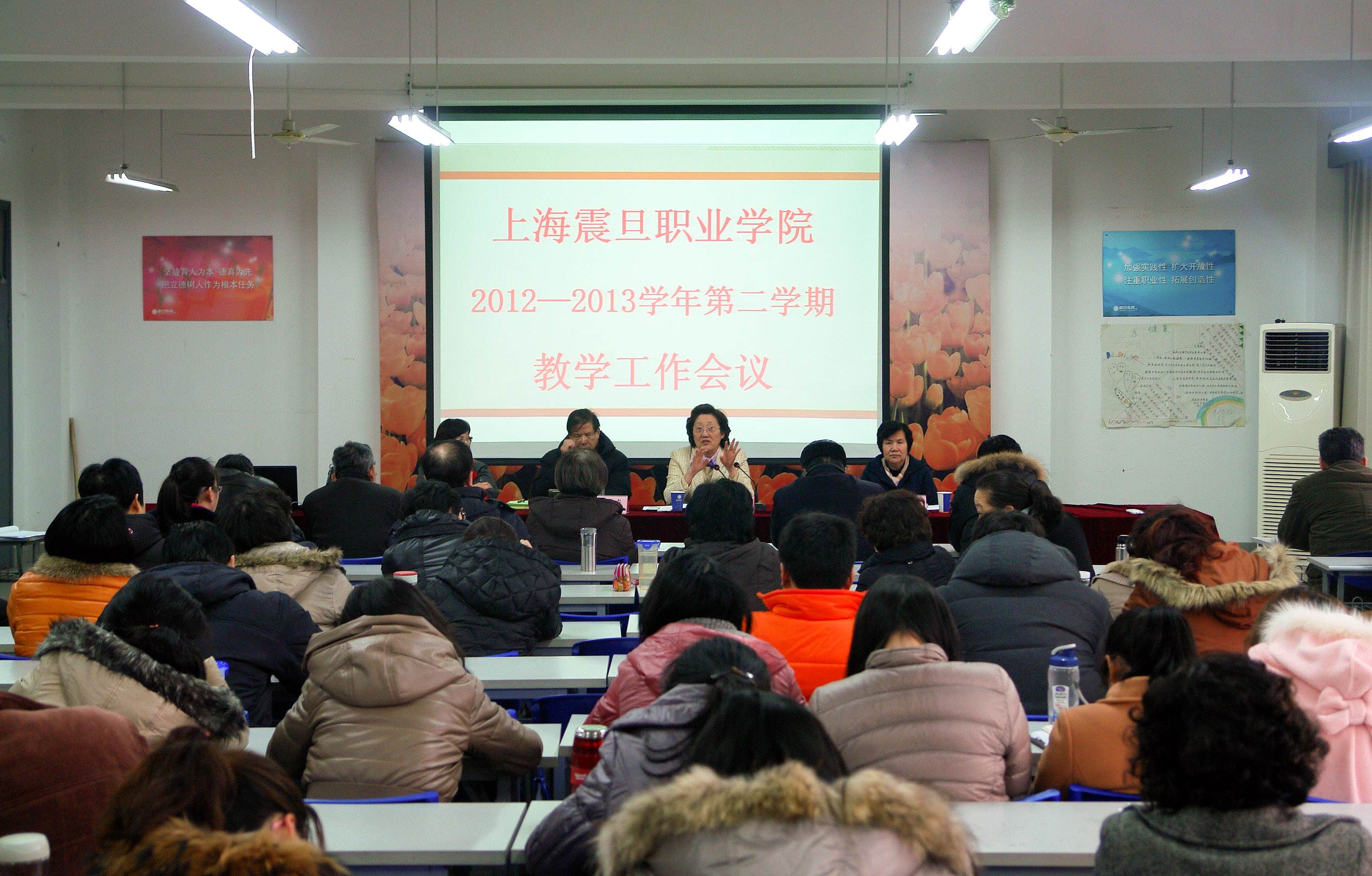 2013年3月1日,我院在2号楼305教室举行2012-2013学年第二学期教学工作会议,图为董事长张惠莉在会上讲话。
