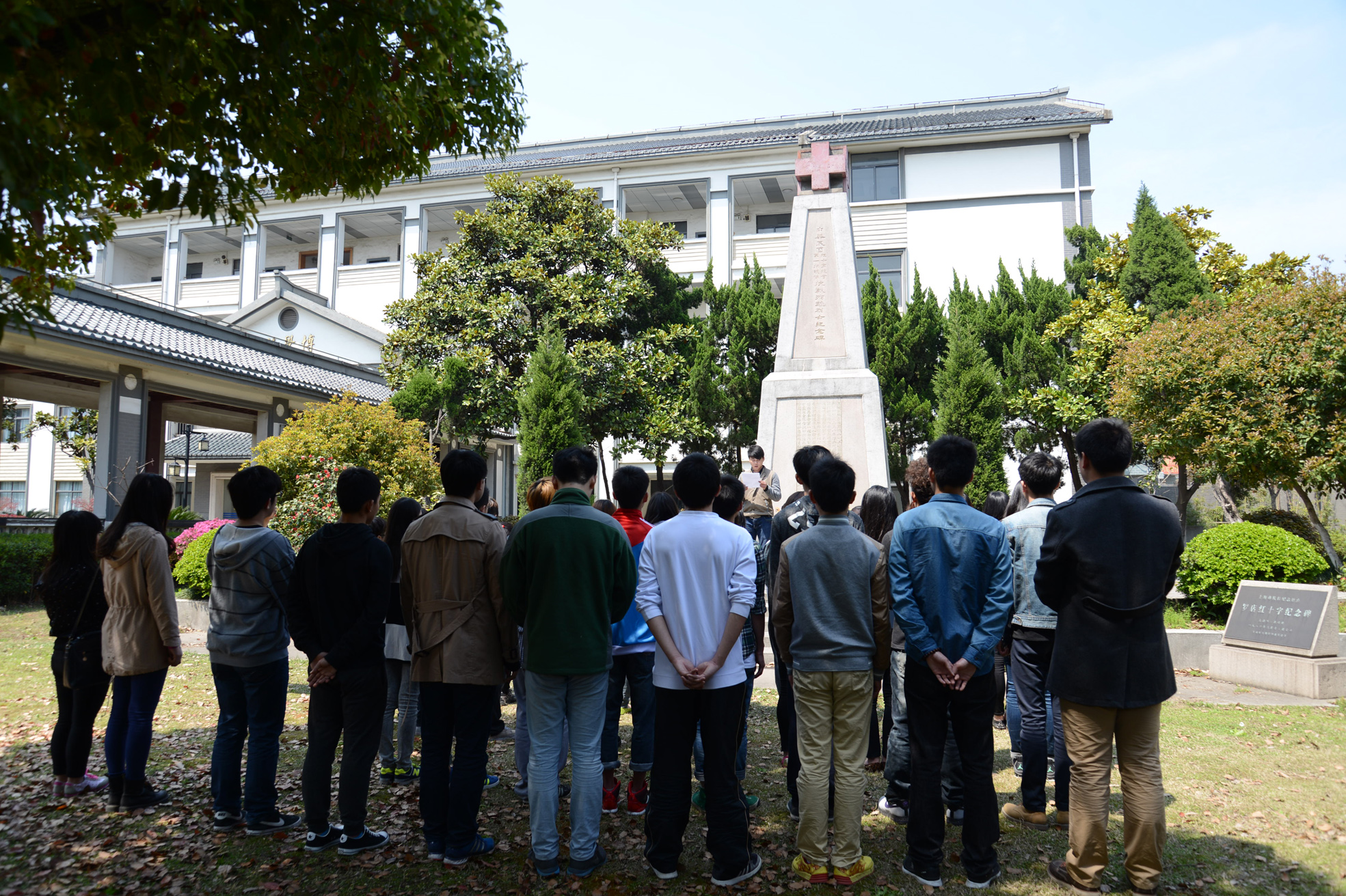 4月3日中午11:30,队伍准时从学校出发,师生代表约40人一行步行来到罗店抗战殉难烈士纪念碑。
