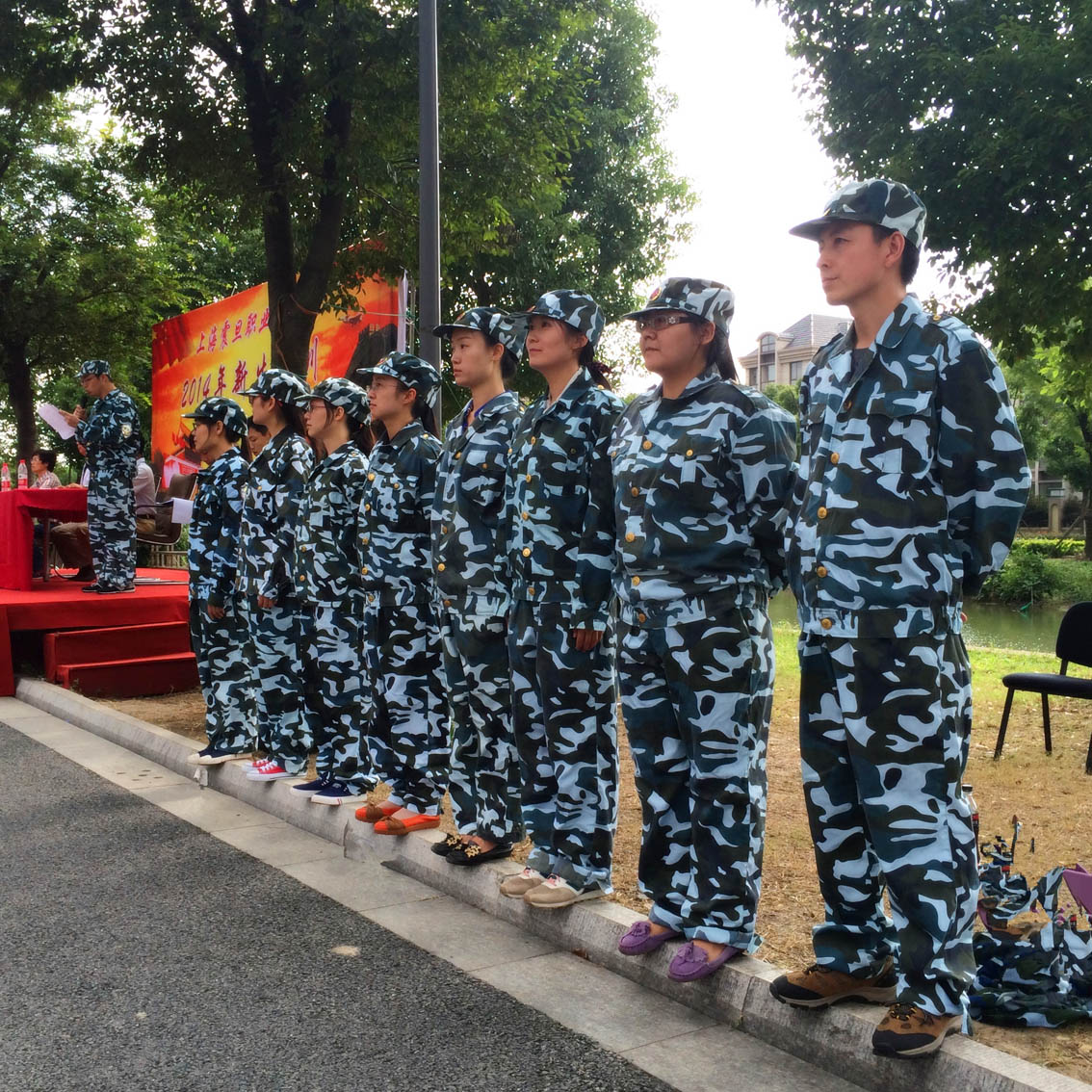 下午3时整,在基地广场上,全体新生身着迷彩训练服装,列队整齐,斗志昂扬,在嘹亮雄壮的国歌声中开营仪式拉开帷幕。