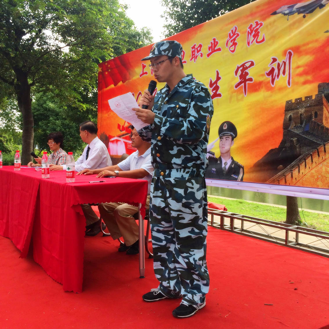 战骄阳磨意志,勇拼搏展英姿。2014年9月20日下午,我校2014级全体新生在昆山训练基地隆重举行军训开营仪式。院长、党委副书记杜飞龙、党委副书记夏臻代表学院领导参加了开营仪式。开营仪式由负责我院承训的马教官主持。