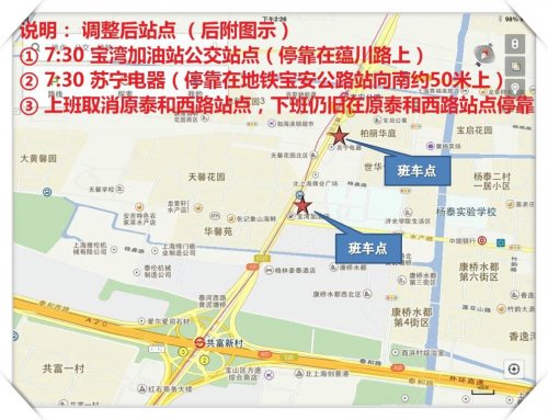 从10月13日起学院班车线路调整如下:① 7:30 宝湾加油站公交站点(停靠在蕴川路上)② 7:30 苏宁电器(停靠在地铁宝安公路站向南约50米上)③ 上班取消原泰和西路站点,下班仍旧在原泰和西路站点停靠