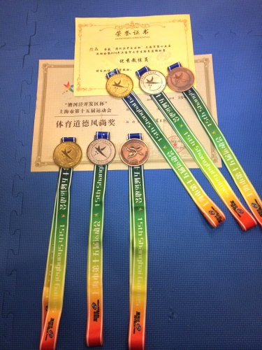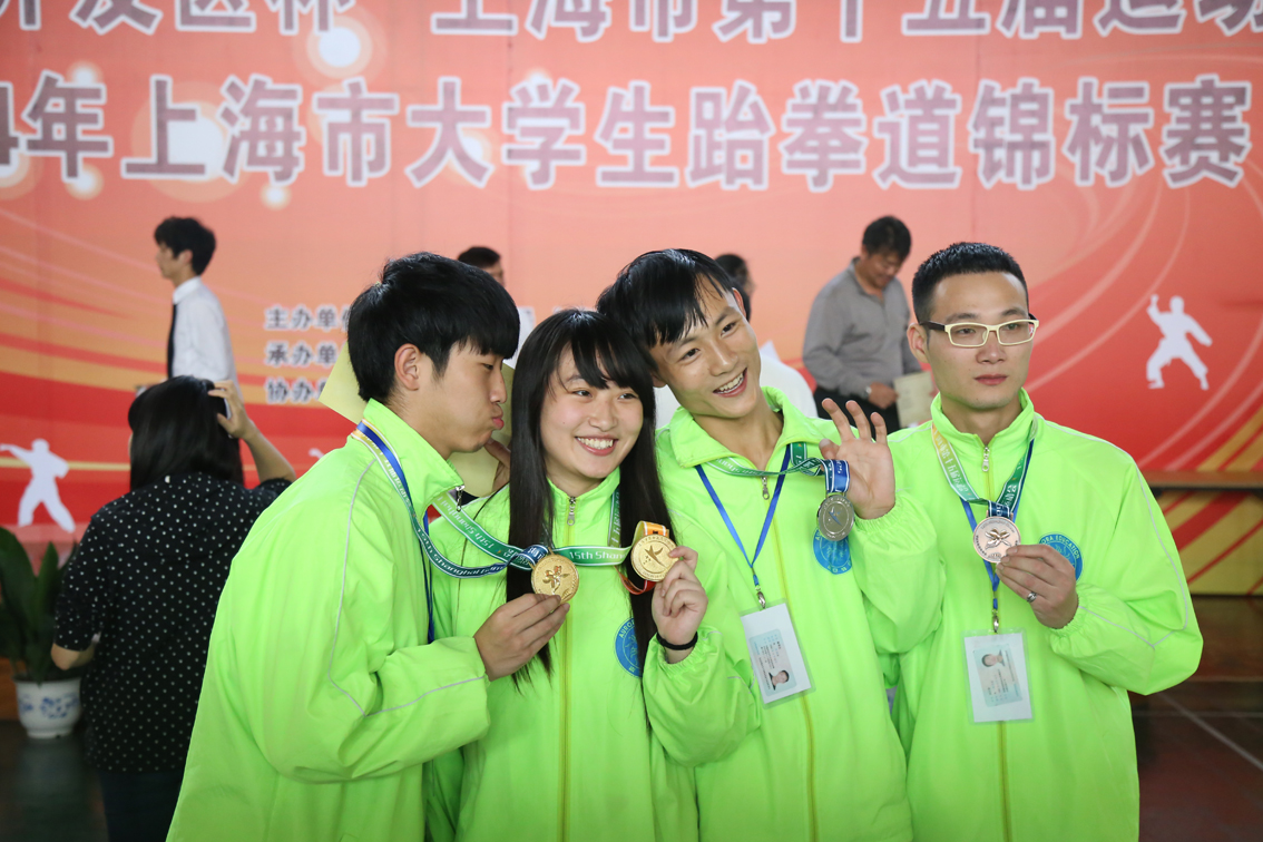 我校在本次上海市第十五届运动会跆拳道高校组比赛中共获得 2 金 2 银 2 铜,获体育道德风尚奖、男子团体竞技赛第二名,徐磊老师荣获“优秀教练 ” 称号。同时男子个人竞技总分排名第三,女子个人竞技总分排名第五。