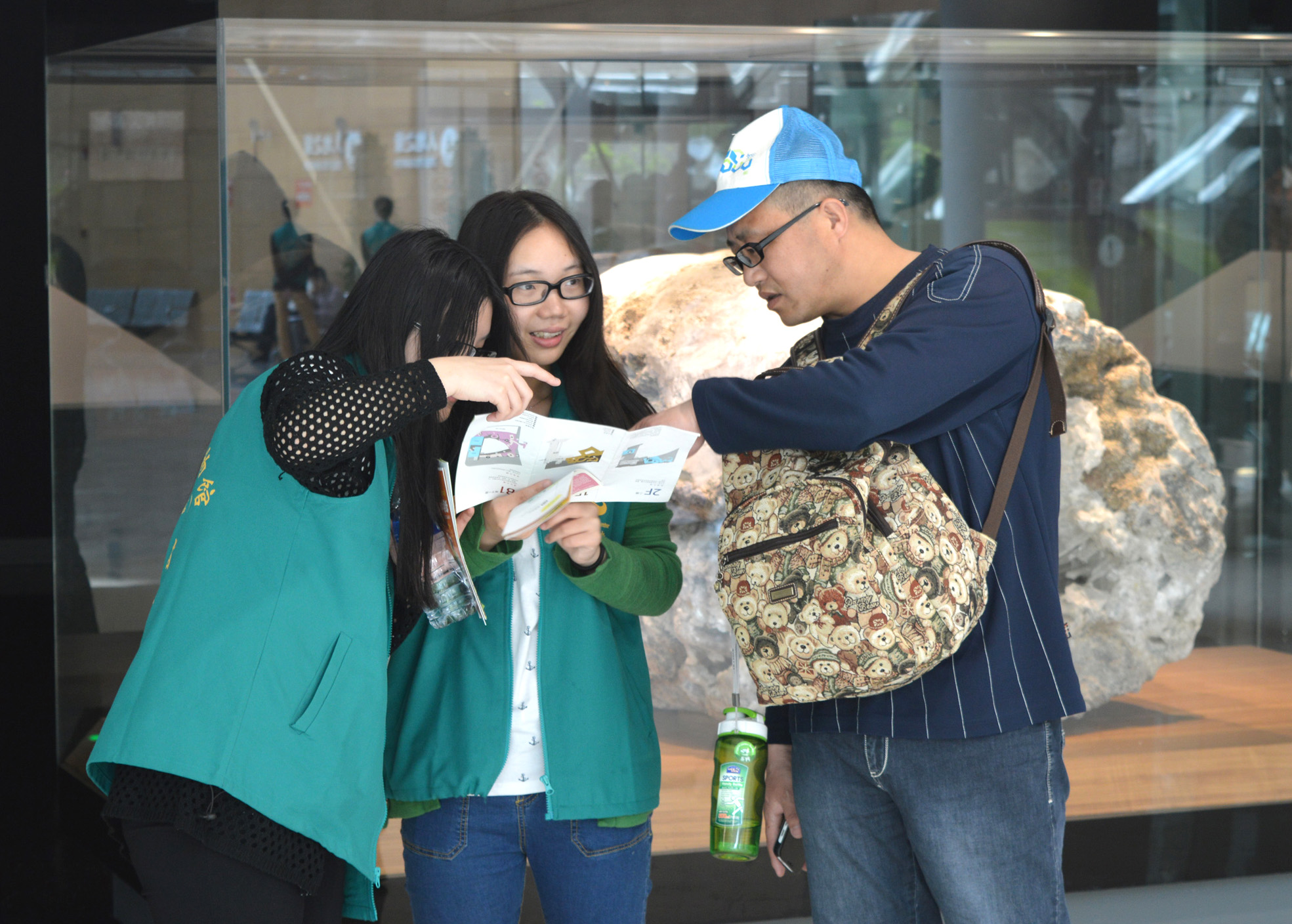 在经过简单的培训之后,志愿者们便开始了一天的工作。在巨大的“鹦鹉螺”中,你到处都能看见“小绿螺”们活跃的身影:无论是像维持馆内进出秩序、指路引导、看护展品这样简单而机械的常规工作,还是处理突发状况、示范仪器使用这类灵活性要求较高的工作,志愿者们都能出色完成。