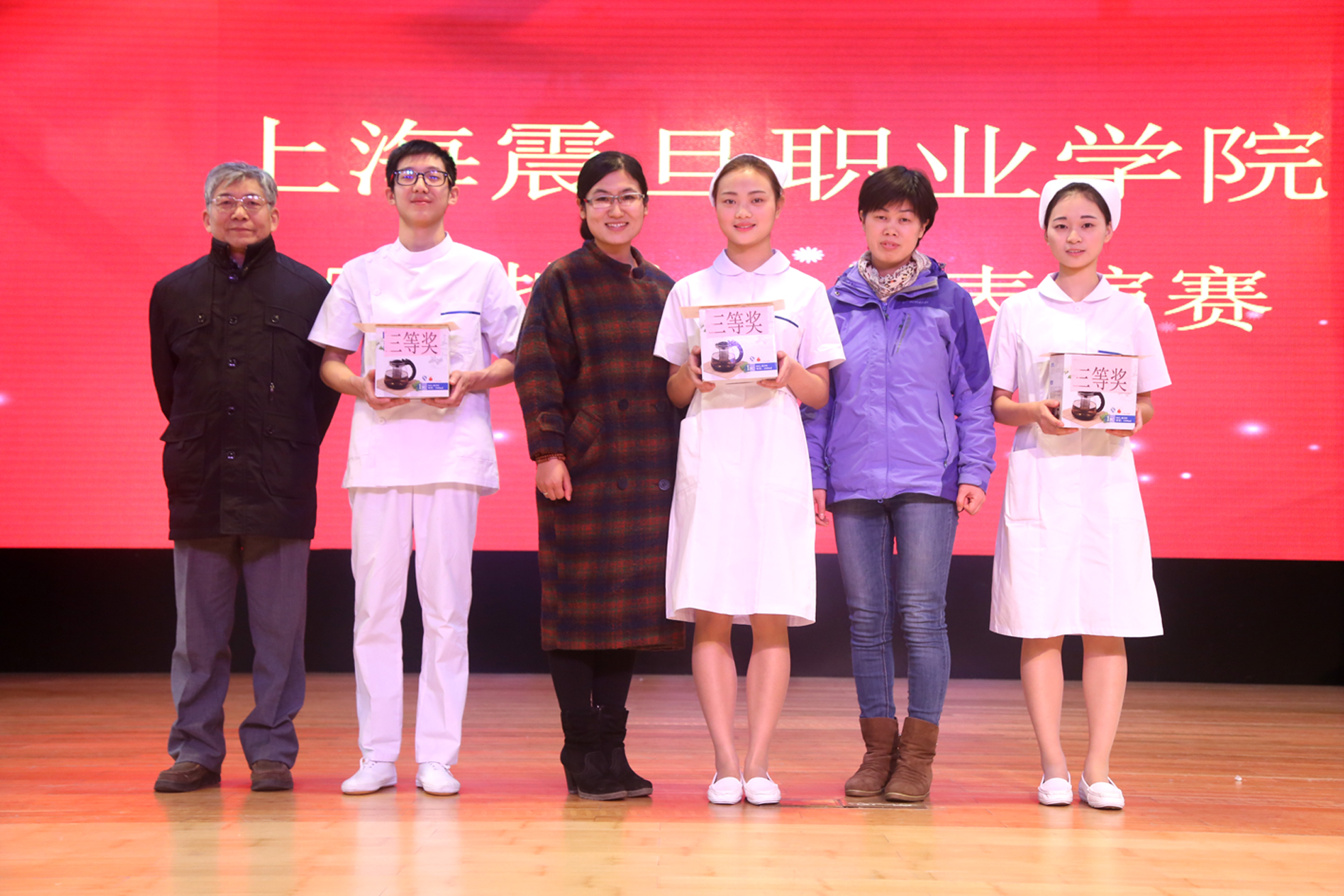 教务处处长张莹、督导室主任吴德清、实践办主任叶素梅为个人和团体三等奖颁奖,公共卫生与护理学院院长赵佩君、院团委书记曹晓莉为个人和团体二等奖颁奖,院党委副书记夏臻为个人一等奖颁奖,院长杜飞龙为团体一等奖颁奖。