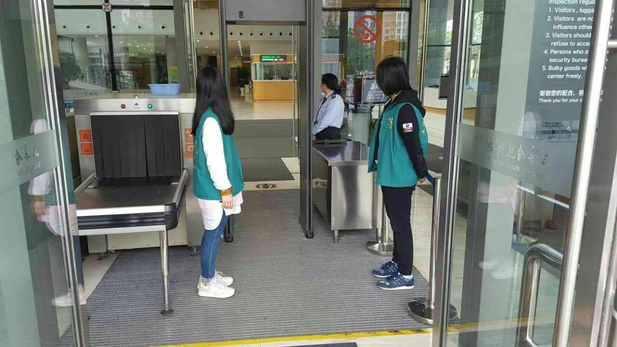 每天早上6点40分,志愿者们从学校出发前往自然博物馆,8点30正式上岗,身穿绿色的志愿者马甲在各自的岗位上开展工作:负责安保区的志愿者任务艰巨,每一个进门的游客都必须仔细检查,以防带进违禁品;运保区的志愿者负责为前来参观的游客检票;负责生命长河与体验自然的志愿者在为游客细心讲解各种植物的名字;负责演化之道与未来之路的志愿者积极为游客指引与简介;负责上海故事的两名志愿者,坚守岗位,为游客们指路;负责人地之缘、大地探珍的同学,尽职尽责,带领游客进出体验区等。