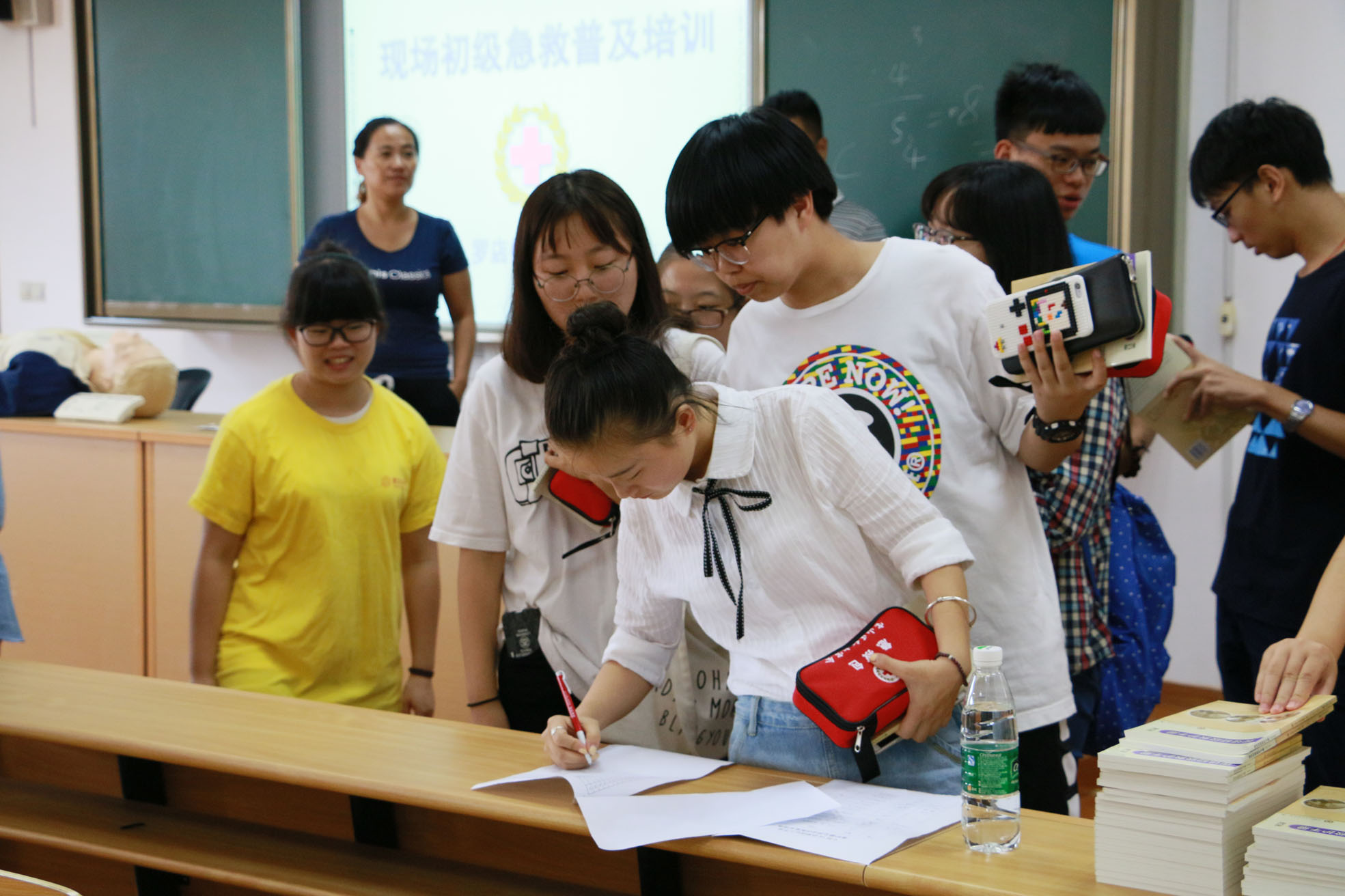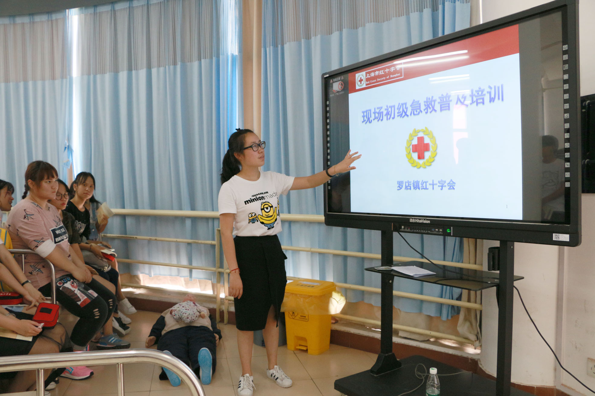9月18日下午,我校公共卫生与护理学院2016级600名新同学分两批在1号楼四楼和五楼6个护理实训室参加了一场意义非凡的现场救护普及员培训。此次培训由罗店镇红十字会与校团委共同联合举办,旨在帮助同学们初步了解基础应急救护知识,提高广大医学生的安全意识和自我保护能力。