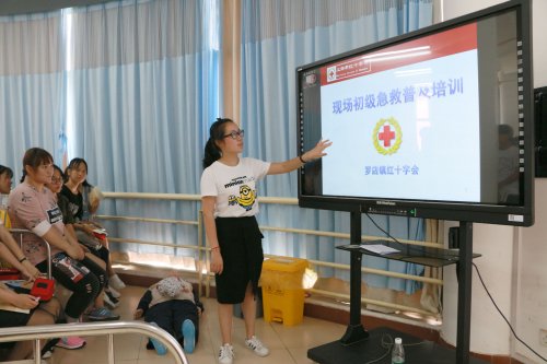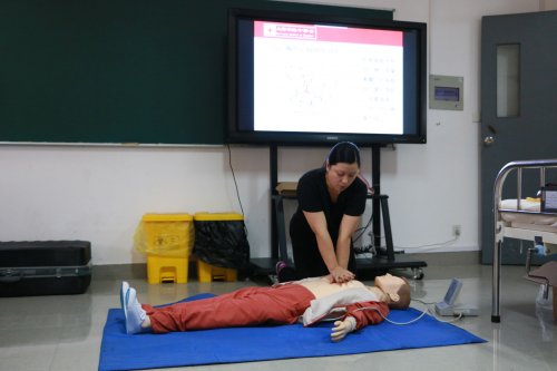 来自罗店医院、罗店镇社区服务中心等单位的老师们在8个课时的培训时间内,为同学们现场讲解了救护概念并且演示了遭遇突发事故的救护方式:如何在抢救的黄金时间内给生命垂危的病人实施心肺复苏。现场的气氛非常活跃,大家跃跃欲试,对模拟演示表现出了浓厚兴趣。在老师们的帮助指导之下,以模拟人为道具,同学们在实际动手操作中学会了胸外按压和人工呼吸这一抢救方法。