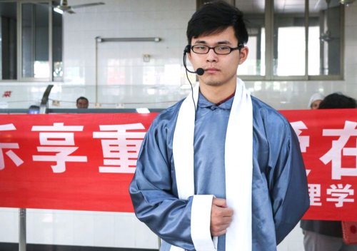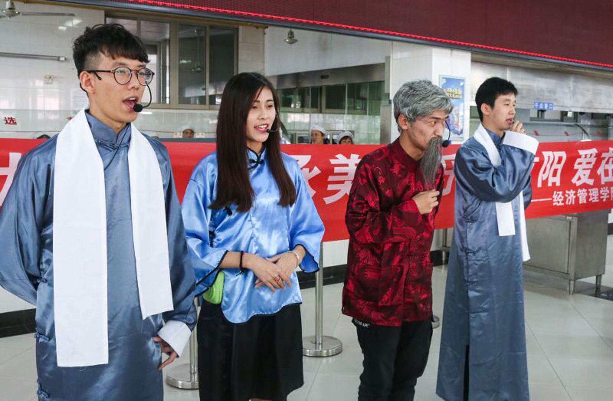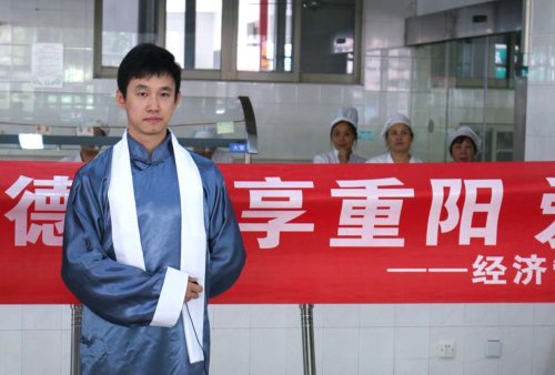 10月9日中午11:50分来自经济管理学院团总支的一支“队伍”突然“闪现”在学校食堂内。随着音乐声响起,早早就“潜伏”在食堂各角落的“乔装”人员“穿越”而至,他们长袍加身,她们裙角飞扬,他们温文尔雅,她们端庄秀丽。他们围绕在“白发苍苍”的老人身边,她们用诗词带来节日的祝贺。收获温暖的季节,感悟佳节的真谛。我们以“快闪”方式展开了向老人表达了心意。