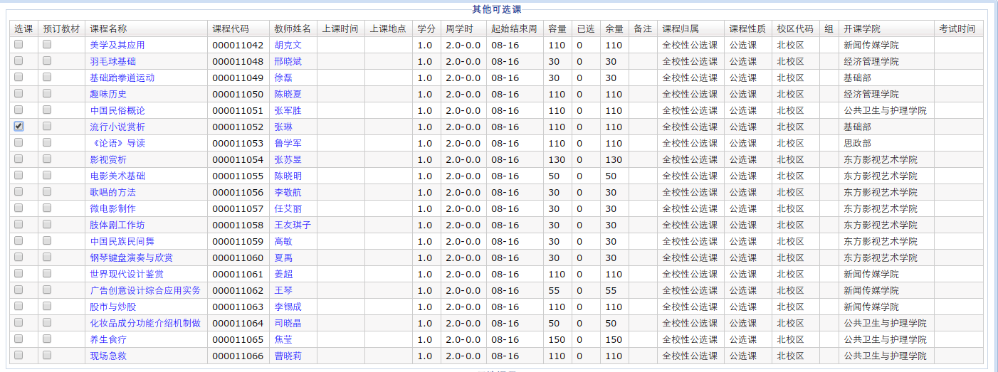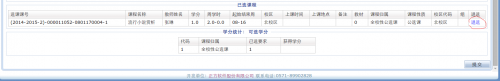 各位2015级同学: 2016-2017学年第1学期课程网上选课即将开始,现将选课安排及有关注意事项通知如下: 一、 选课网上操作步骤(示例) 所有选课操作需先登录教务管理系统,网址:http://tams.aurora-college.cn/,在页面中左上角【网上选课】——【全校性选修课】中进行,见图1, 图1 在选课处勾选课程,见图2, 图2 在右下角点击【提交】,见图3, 图3 提交之后在【已选课程】表格下即显示所提交的课程,右侧有【退选】选项,见图4,如需改选其他课程,点此后重复前述操作即可。 图4 二、 课程模式、选课形式、面向对象及时间安排 课程模式: 1.本校面授 2.网上授课 选课形式:优先制(即选即得、先到先得、额满为止)。 面向对象:2015级学生 选课时间:2016年10月11日(19:00)至10月13日(12:00),过时不再开放。 上课时间: 1.本校面授类课程,07-15周的每周二18:30-20:00 2.网上在线类课程,10月14日将于礼堂开设在线类课程导学课,通知具体学习安排。 三、选课学分、成绩记载要求 1、每学期每名学生限选1门,学分1.0。 2、所有课程在选课时间截止后,学生不得再申请补、改、退选。学生须按时上课并参加考核,教师按实际情况评定并录入成绩。 天博com体育网站 教务处 二〇一六年十月十一日