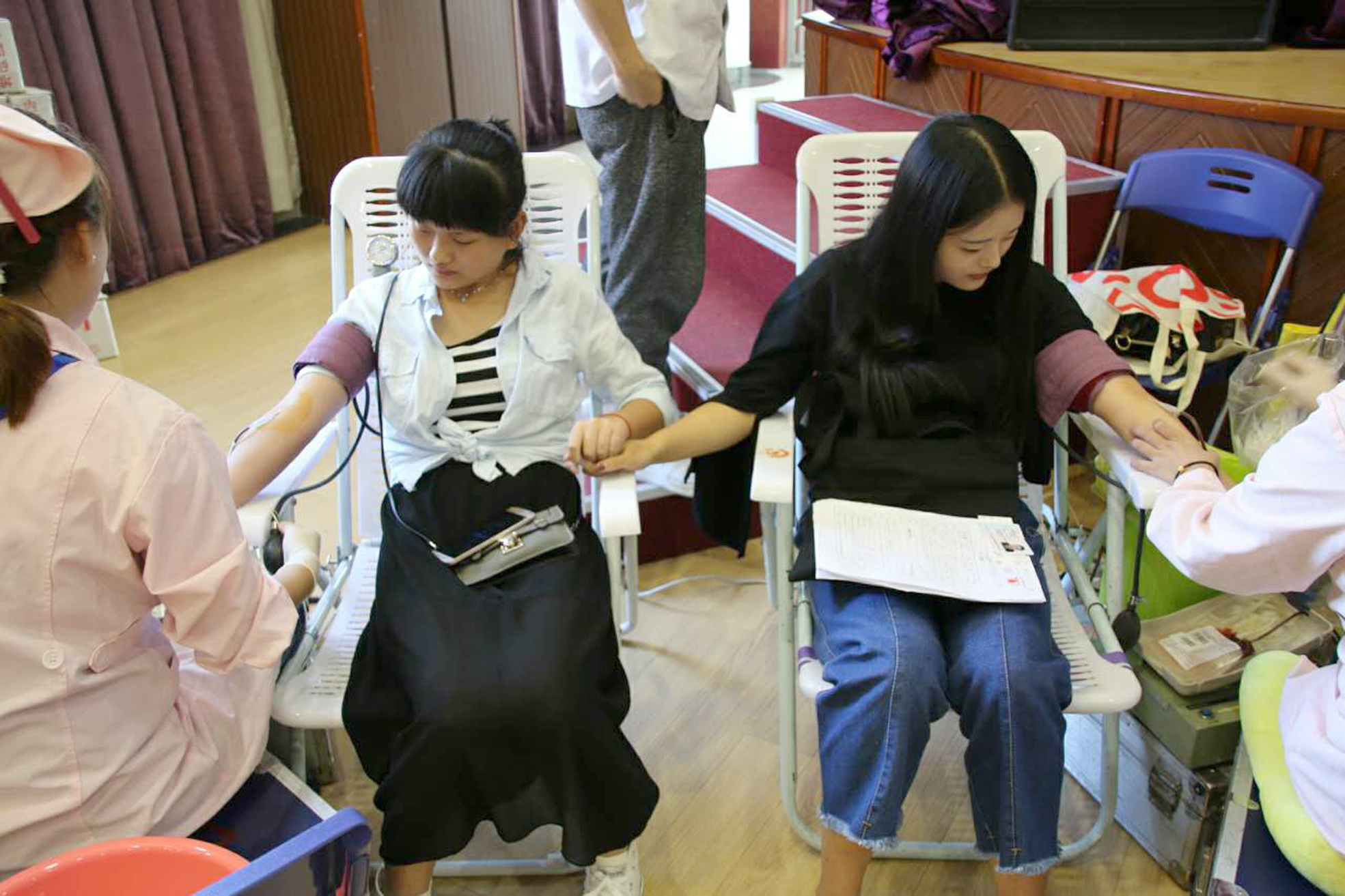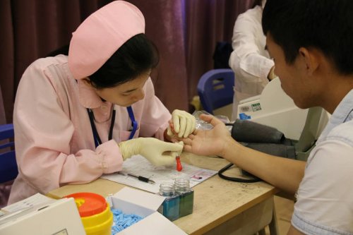献血活动在八点半活动准时开始,大家排着整齐的队伍填写登记表,进行确认、核对信息。没多久就开始了进行抽血阶段,每个人都献出了自己宝贵的200cc的血液,抽血结束后志愿者带着他们往休息区休息和观察。