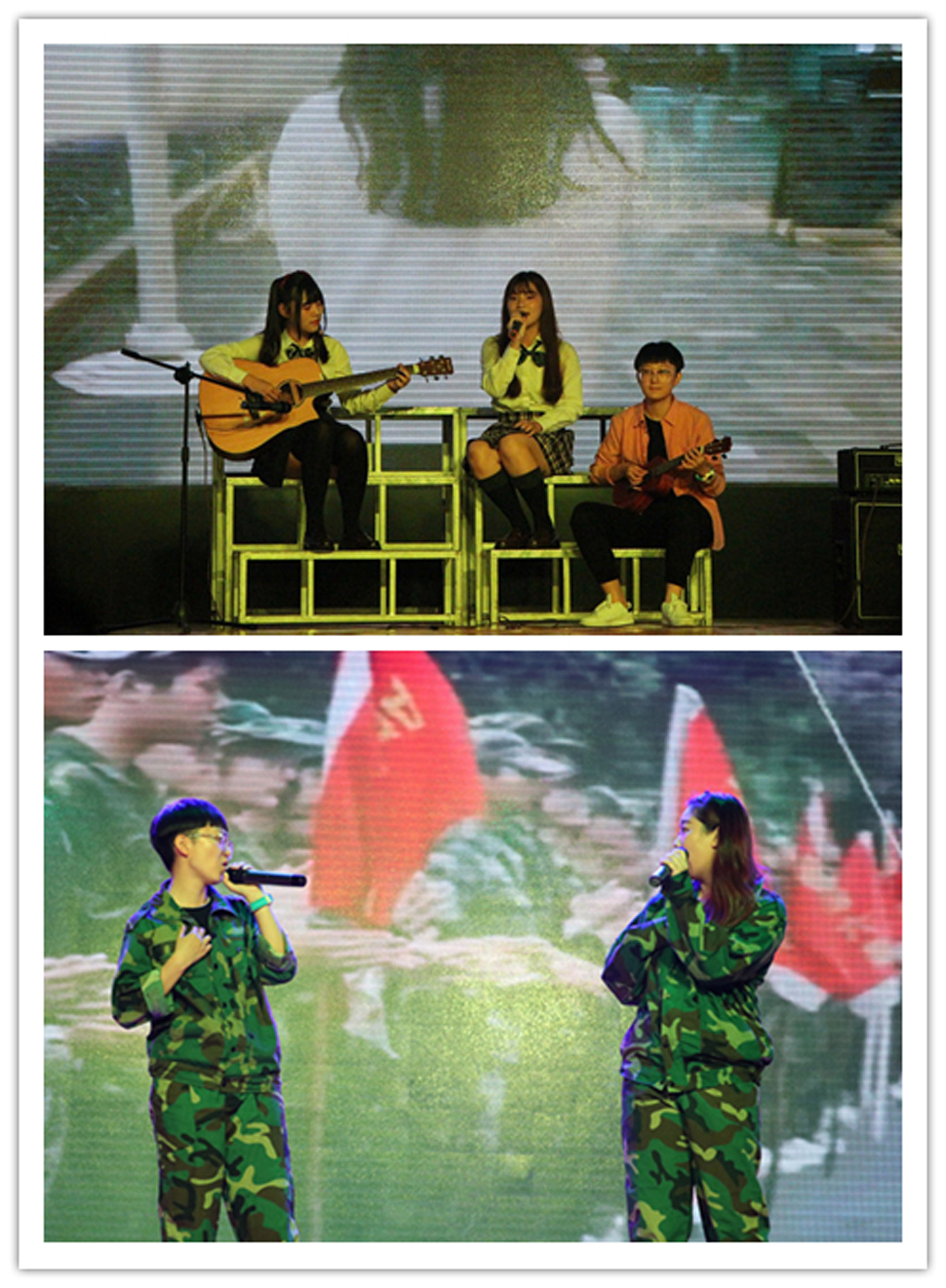 小品节目过后,高潮随之来临。众多社团以节目的形式,向同学们展现了社团文化的软实力。轮滑社带来的《大王叫我来巡山》多项高难度动作,都令台下的观众惊呼不已,深深领略到了轮滑的魅力。吉他社与舞蹈社带来的才艺展示,将我校同学的阳光一面与对音乐及歌舞的热爱进行了完美诠释。《甄嬛后传》则是由话剧社带来的一出幽默喜剧,剧中的精彩笑点令同学们捧腹不止。随后手语社的的《虫儿飞》和《夜空中最亮的星》的表演令人感动。武道社《震旦武魂》通过不同的表现方式与详尽具体的介绍结合各项高难度的跆拳道动作,也博得了观众们的一致好评。朗诵《少年中国说》则在临近晚会的末尾时将同学们的强国爱国之心展现的淋漓尽致。最后,手影舞《“新”的旅程》将整场晚会推向高潮,张开的手掌宛如黑暗中的一束光,成员默契的团队合作,手影与歌曲相结合,震撼全场!