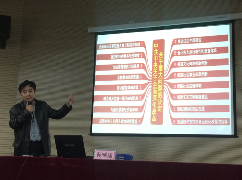11月10日晚,学院党委书记黄晞建教授为我院高级党校学员做了《面向未来,你准备好了吗?》的主题报告。报告深入浅出的对十八大三、四、五、六中全会的逻辑关系进行了讲解,并结合中共中央关于全面深化改革若干问题的决定和"十三五"规划纲要草案中的民生看点,从生育政策、教育改革、就业创业、城乡统一的建设用地、医疗保障制度、国家产权保障体制改革等方面进行了分析,学员们受益匪浅。(撰稿 张莉)