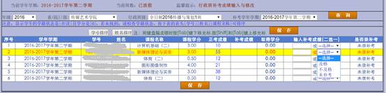 出现参加补考学生的信息,请在“输入补考成绩”中录入该生成绩。(请在下拉窗口中选择“及格”“不及格”“未补考”);请在左边栏输入申请缓考学生的总评分数。