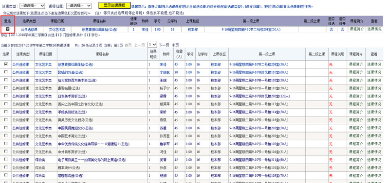 进入选课页面后,点选【显示选课课程】,本学期所开设的选修课将以列表形式呈现,见图2,