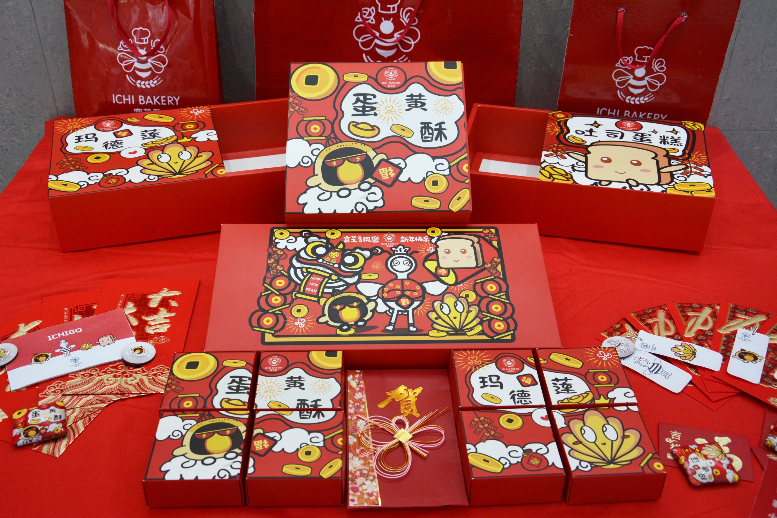 三等奖作品“宜起过大年”:当甜甜的糕点化身萌萌星人,可爱又童趣十足。将宜芝多的LOGO拟人化,从小蜜蜂的元素进行延伸,设计出系列动漫IP形象,将宜芝多的品牌内涵以活泼、通俗易懂的方式传达出去。