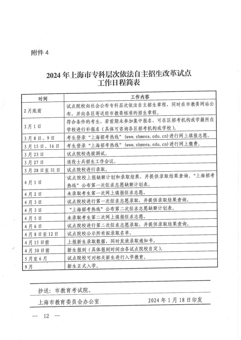 转载:2024 年上海市专科层次依法自主招生改革试点工作日程简表