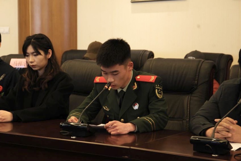 刚退役返校的老兵戚海星发言。他讲述了自己在部队的默默坚守,对服役期间学校领导和老师的关怀表示感谢,并激励即将踏入军营的新兵同志们不负青春、勇往直前,为国防和军队建设亮出震旦学子最闪亮的名片。