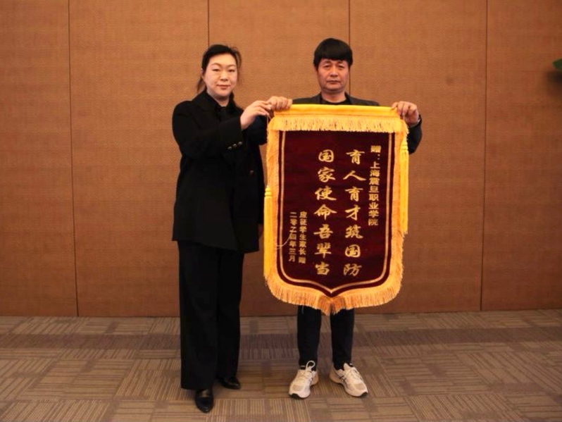 刘伯虎的父亲代表新兵家长向学校赠送锦旗,感谢学校的培育之恩。
