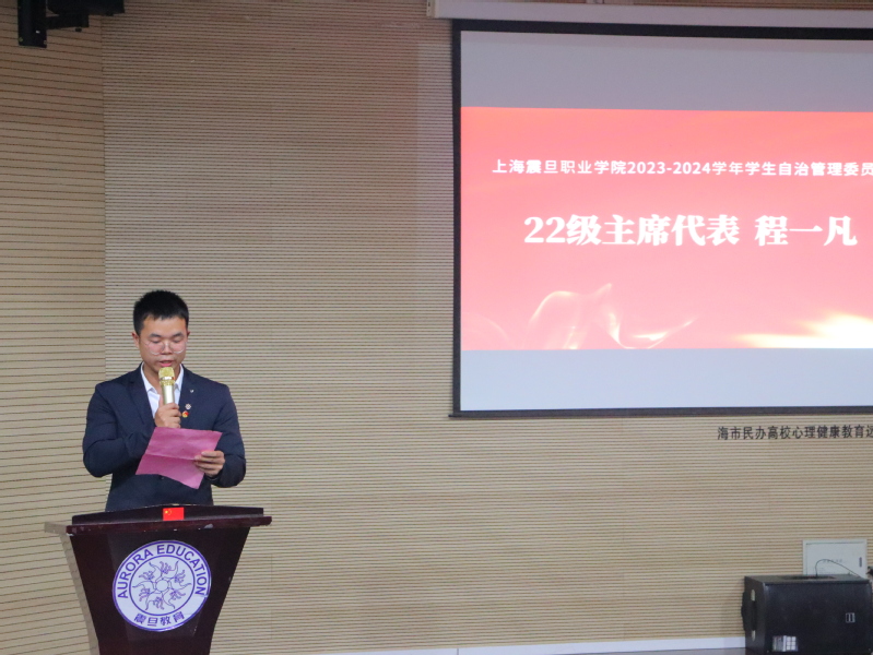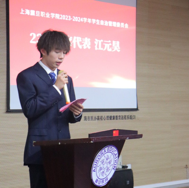 新一届主席团代表江元昊同学发言。他对未来自管会的发展提出了建议,并希望新一届自管会汲取老一辈的经验,凝心聚力,砥砺前行,续写自管会新的辉煌篇章。