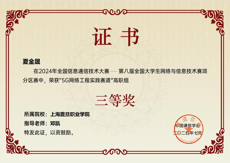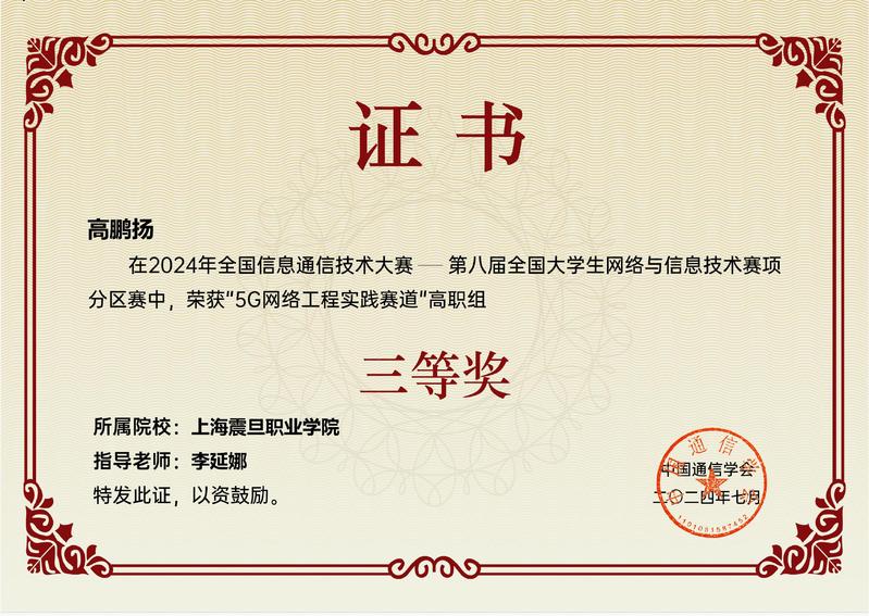 全国大学生网络与信息技术大赛是面向全国高校在校学生的科技类竞赛活动,本次竞赛要求选手在竞赛平台中完成5G网络的拓扑规划、容量计算、设备配置、数据配置、业务开通调试、指标优化及网络故障排查等任务,主要考察选手在不同场景下,5G网络的分析、设计、部署、调试、验收和行业应用等方面的综合实践能力。智能工程学院赛前精心筹备,师生深度钻研5G网络工程的相关技术与应用,持续进行实践并优化,尽显震旦人的卓越风姿。