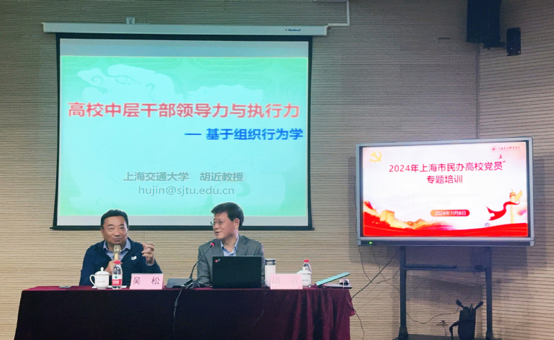 2024年11月8日,由上海民办高校干部和党员研修基地主办、我校承办的2024年上海民办高校党员专题培训班在体艺楼小剧场开班授课。报告会邀请上海交通大学公共管理学教授、博士生导师,原上海交通大学党委副书记胡近教授做“高校中层干部领导力与执行力”专题报告。校党委书记吴松,党委副书记、校长蒋心亚等校领导,以及全体中层干部、培训班全体学员参加了报告会。报告会由吴松书记主持。