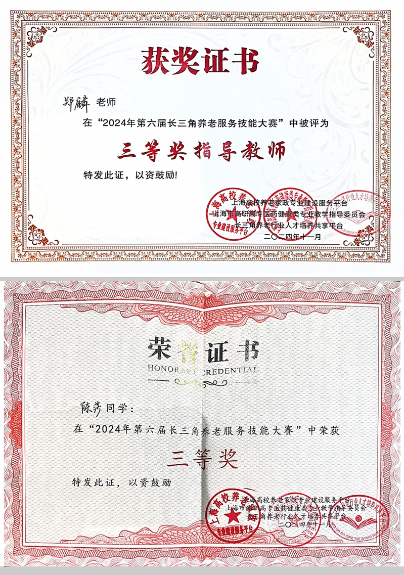 在第六届长三角养老服务技能大赛中,我校公共卫生与护理学院陈莎同学荣获三等奖,陈炫辰同学荣获优胜奖。