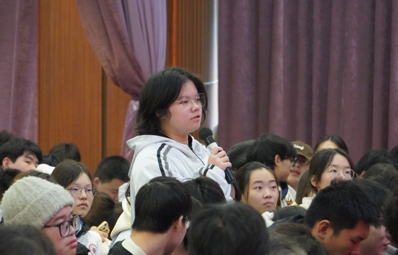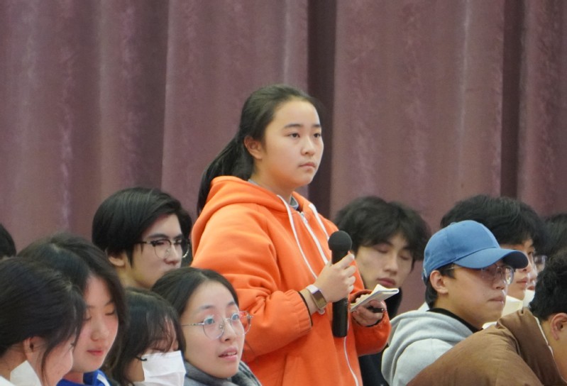 王曙群还与学生进行了现场互动。同学们频频举手提问,王曙群老师一一作答,并鼓励同学们要坚守初心、不断学习,发扬“特别能吃苦、特别能战斗、特别能攻关、特别能奉献”的精神。同学们近距离接触榜样人物,直面交流,向劳模看齐。