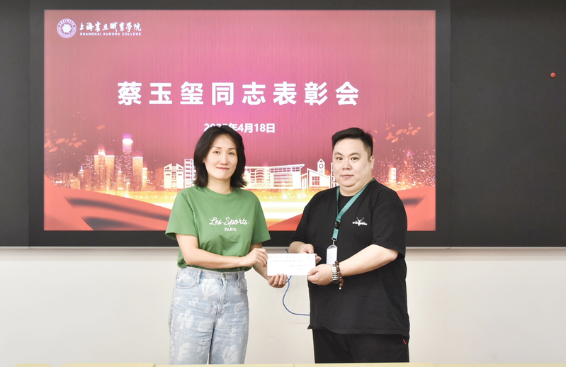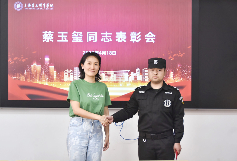 表彰会上,董事长张沈向蔡玉玺所在的英佩设施管理服务有限公司递交了表扬信,信中对蔡玉玺高度负责的工作态度给予了充分肯定和赞扬,随后为蔡玉玺颁发了“校园安全卫士”奖状和奖金。