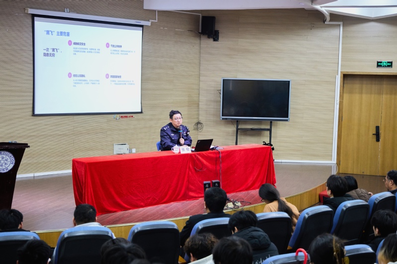 宣讲会上,张俊副所长首先从当前无人机应用普及与随之而来的监管挑战切入,介绍了公安机关开展无人机“黑飞”专项整治行动的背景,生动剖析了“黑飞”行为的危害。他指出,随着无人机技术的快速发展,无序、违规飞行现象日益增多,给国家安全、军事安全、公共安全及个人隐私带来严峻挑战。他呼吁广大师生,尤其是无人机爱好者,务必树立“空中交通”规则意识,主动学习相关法律法规,绝不可心存侥幸、以身试法。